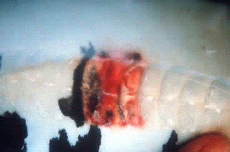 - تقرّحات في الجلد، تآكل زعانف، نقاط نزفية تحت الجلد أو في البطن